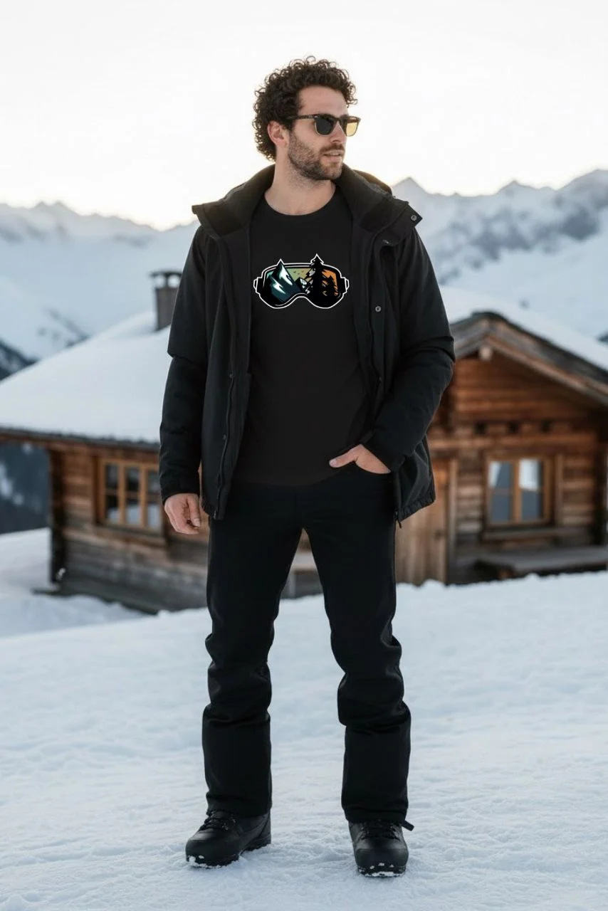 Das GOGGLES T-Shirt ist bewusst reduziert. Kein großes Motiv, kein Geschrei – nur ein klares Symbol für Berg, Schnee und Haltung. Der Schnitt sitzt sauber, fällt gerade und bleibt lang genug. Genau richtig für entspannte Stunden abseits der Piste.