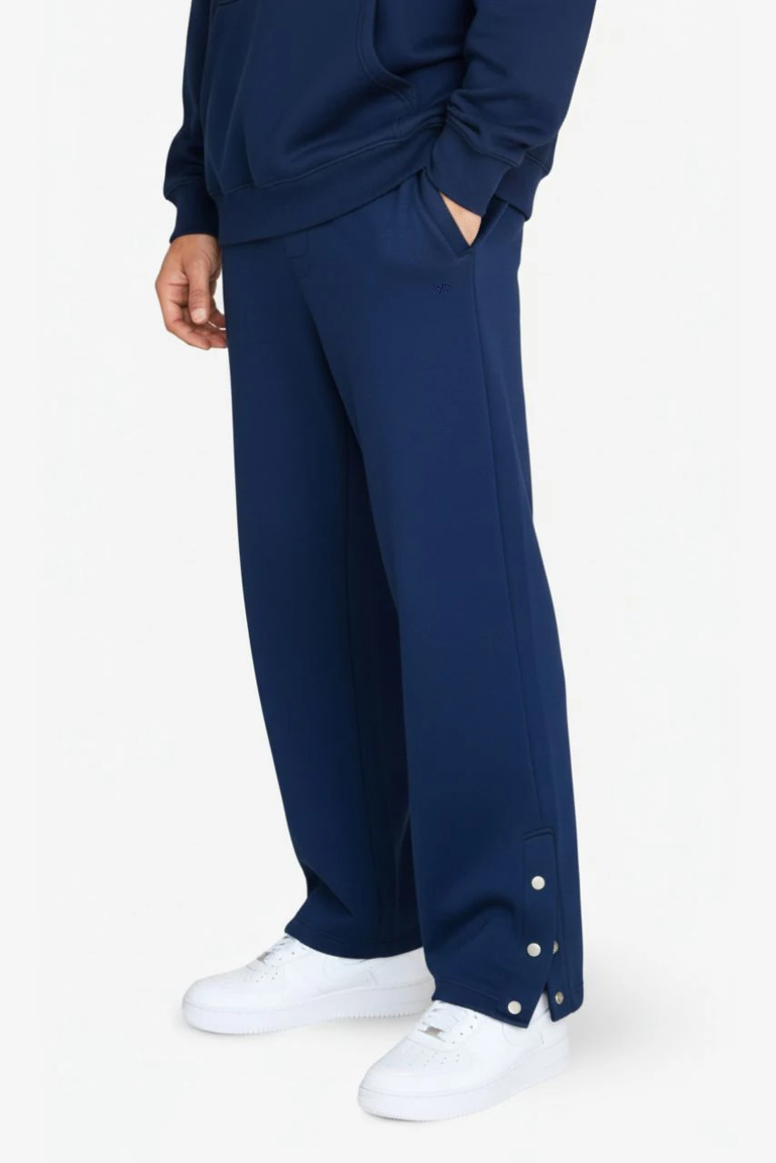 Die Knöpfe unten am Hosenbein sind ein echtes Funktionsdetail. Aufknöpfen, Hose über die Schuhe ziehen, fertig. Du musst deine Sneaker nicht ausziehen. Der dezente 195-Stanz in den Knöpfen zeigt klar, wofür die Sweatpants steht. Gerade nach dem Basketball oder Training ein klarer Vorteil.